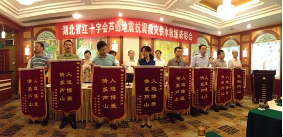 6月3日,湖北省紅十字會(huì)蘆山地震抗震救災(zāi)供水救援表彰會(huì)在武漢召開(kāi)。表彰會(huì)上,荊門市供水總公司黨委書記陳永根作典型發(fā)言,荊門市供水總公司被授“情系蘆山 人道博愛(ài)”錦旗,參與供水救援的隊(duì)員彭華、黃洋獲得嘉獎(jiǎng),榮獲廬山地震抗震救災(zāi)先進(jìn)個(gè)人稱號(hào)。