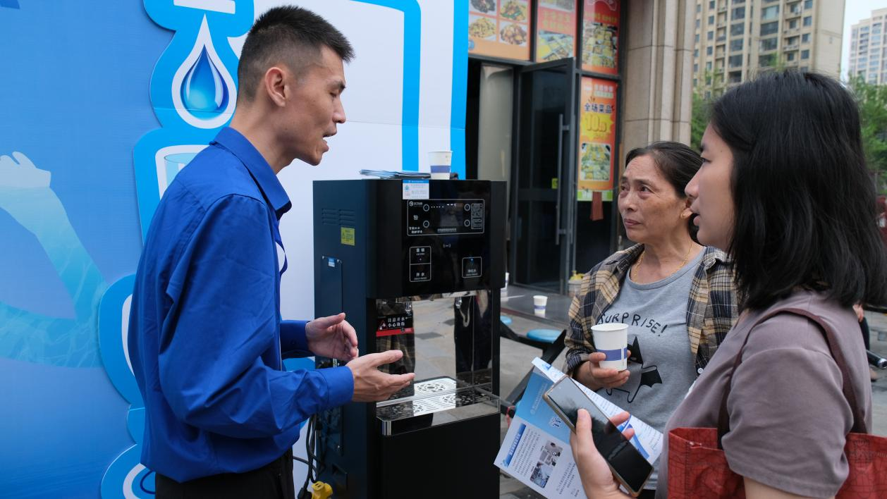 直飲水建設成果展區(qū):市水務集團講解員通過展板與水質(zhì)檢測設備,詳細介紹全市直飲水管網(wǎng)布局、水質(zhì)標準(優(yōu)于國家標準)及已服務超3萬戶家庭的實踐成果。