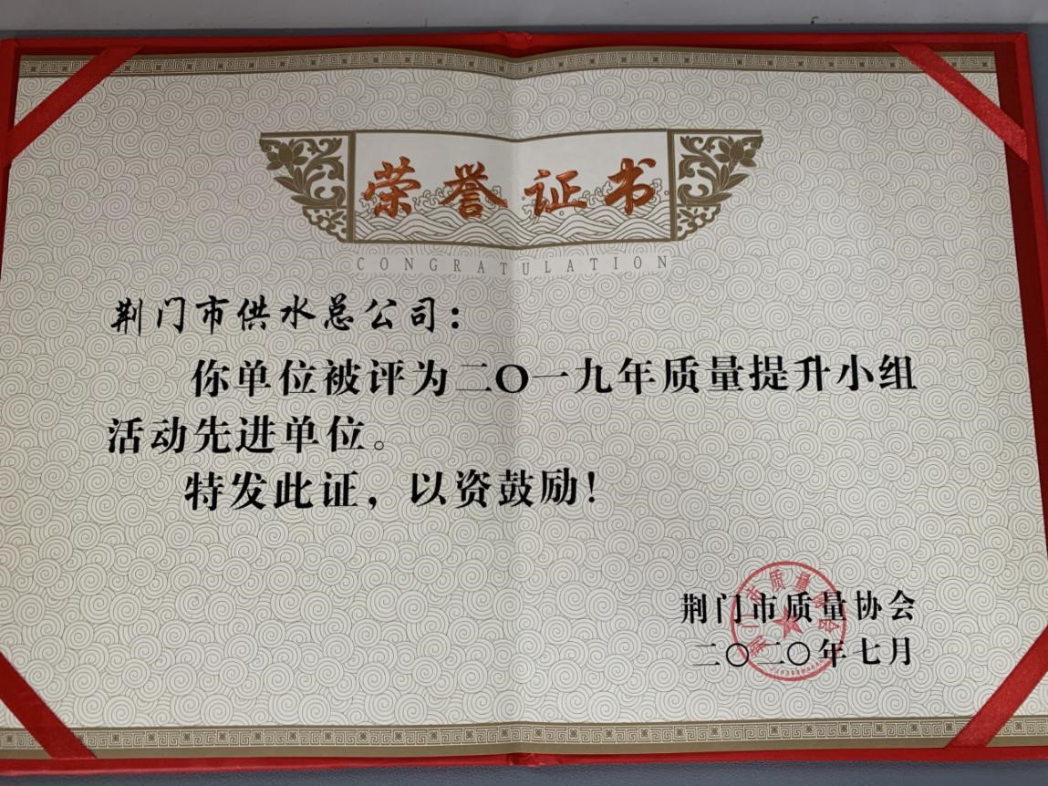7月16日,荊門(mén)市第十五次質(zhì)量提升小組代表會(huì)議召開(kāi)。會(huì)上,市供水總公司被評(píng)為2019年質(zhì)量提升小組活動(dòng)先進(jìn)單位,其中發(fā)布的“縮短掇刀中壓區(qū)停水時(shí)間”和“提高廠站出水水質(zhì)”兩項(xiàng)QC成果獲一等獎(jiǎng),“提高廠站設(shè)備巡查時(shí)實(shí)率”QC成果獲二等獎(jiǎng),公司黨委委員、副總經(jīng)理被評(píng)為卓越領(lǐng)導(dǎo)者,生產(chǎn)安全部經(jīng)理劉昕平被評(píng)為優(yōu)秀推進(jìn)者。